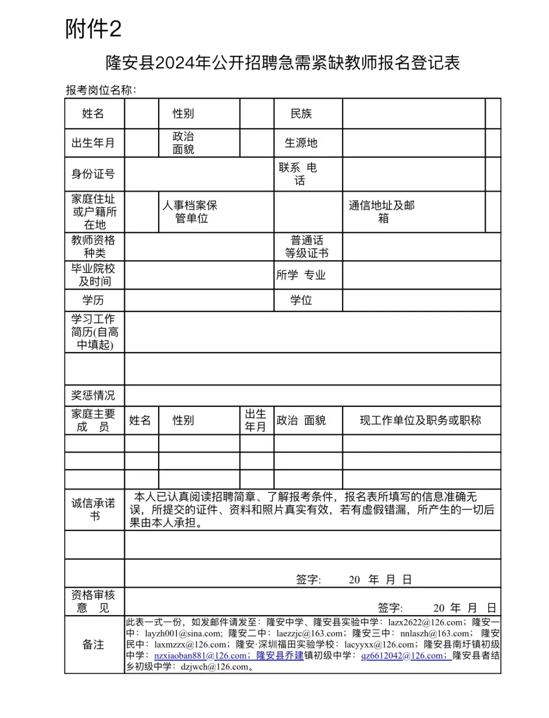 (1)“隆安縣2024年公開招聘急需緊缺教師報(bào)名登記表”電子版??傻卿洀V西南寧市人力資源和社會保障局網(wǎng)站、廣西南寧市隆安縣人民政府門戶網(wǎng)站、隆安縣民族中學(xué)微信公眾號下載。