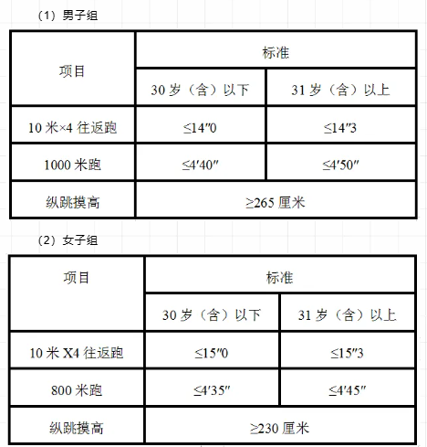 3.參照《關(guān)于印發(fā)公安機(jī)關(guān)錄用人民警察體能測評項目和標(biāo)準(zhǔn)(暫行)的通知》(人社部發(fā)〔2011〕48號)的項目及測試規(guī)則,結(jié)合《公安民警體育鍛煉達(dá)標(biāo)手冊》成績標(biāo)準(zhǔn),體能測評的項目和標(biāo)準(zhǔn)如下:
