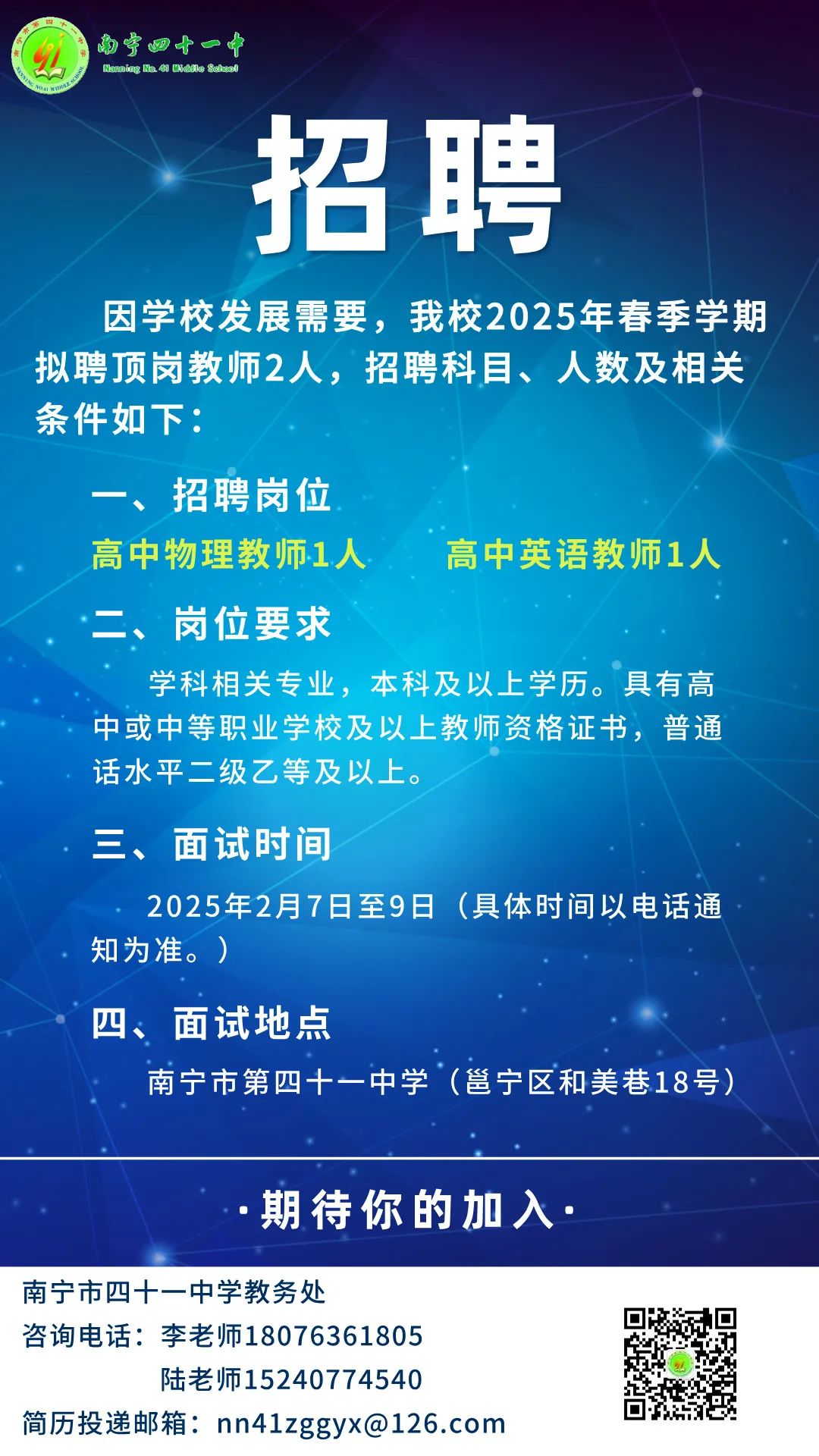 2025年春季學(xué)期南寧市第四十一中學(xué)關(guān)于公開招聘頂崗教師2人