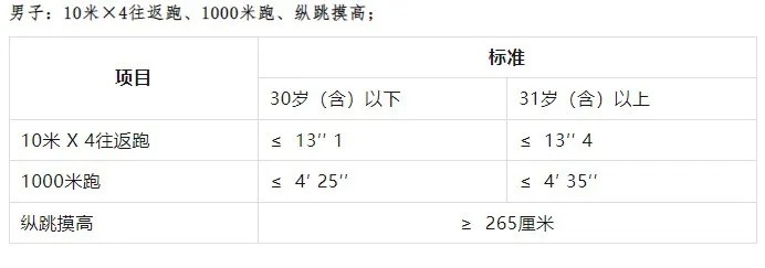 2.體能測評項目和標(biāo)準(zhǔn)按照《公安機(jī)關(guān)錄用人民警察體能測評項目和標(biāo)準(zhǔn)(暫行)》執(zhí)行。體能測評標(biāo)準(zhǔn)報考人員須參加全部三項體能測評,全部達(dá)標(biāo)方為合格,如放棄一項則視為不合格,體能測評合格的方可進(jìn)入下一環(huán)節(jié)。