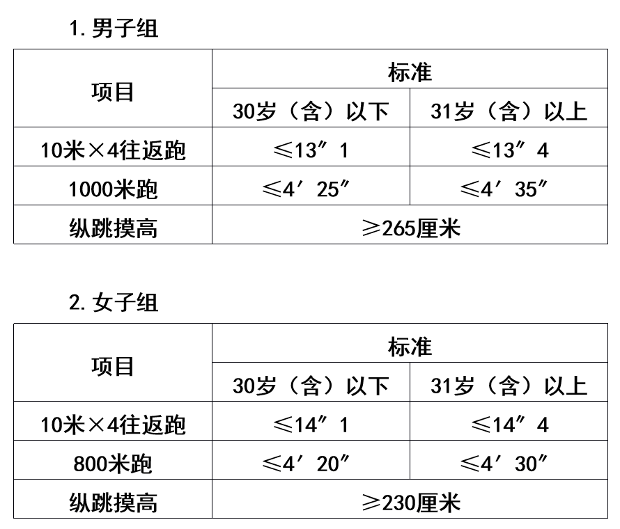 體能測評的項目和標(biāo)準(zhǔn)按照《關(guān)于印發(fā)〈公安機關(guān)錄用人民警察體能測評項目和標(biāo)準(zhǔn)〉的通知》(公政治〔2024〕60號)執(zhí)行,其中綜合管理類、執(zhí)法勤務(wù)類職位測查全部3個項目,警務(wù)技術(shù)類職位免予測查1000米(男)/800米(女)跑項目。對于專業(yè)人才緊缺難以形成競爭的特殊職位(緊缺職位),體能測評三項中有兩項達(dá)標(biāo)的,視為合格。凡應(yīng)測項目中任意一項不達(dá)標(biāo)的,即為體能測評不合格。具體如下: