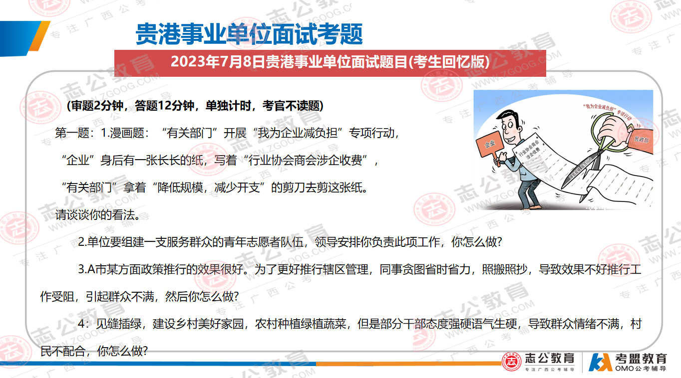 貴港事業(yè)單位面試主要采用結(jié)構(gòu)化面試形式;審題時間:2分鐘;答題時間:12分鐘;考查題量:4題為主??紕?wù)情況:考官不讀題、統(tǒng)一計時、超時會提醒??疾轭}型:綜合分析(極高)、計劃組織(極高)、人際溝通(極高)、應(yīng)急應(yīng)變(較高)、貫徹執(zhí)行(較高)、自我認(rèn)知(一般)。
