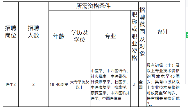 根據(jù)工作需要,決定面向社會公開招聘醫(yī)生(中醫(yī)類)2人,現(xiàn)將有關(guān)事項公告如下: