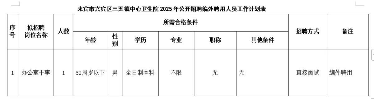 原文標(biāo)題:來(lái)賓市興賓區(qū)三五鎮(zhèn)中心衛(wèi)生院 2025年公開(kāi)招聘編外工作人員公告