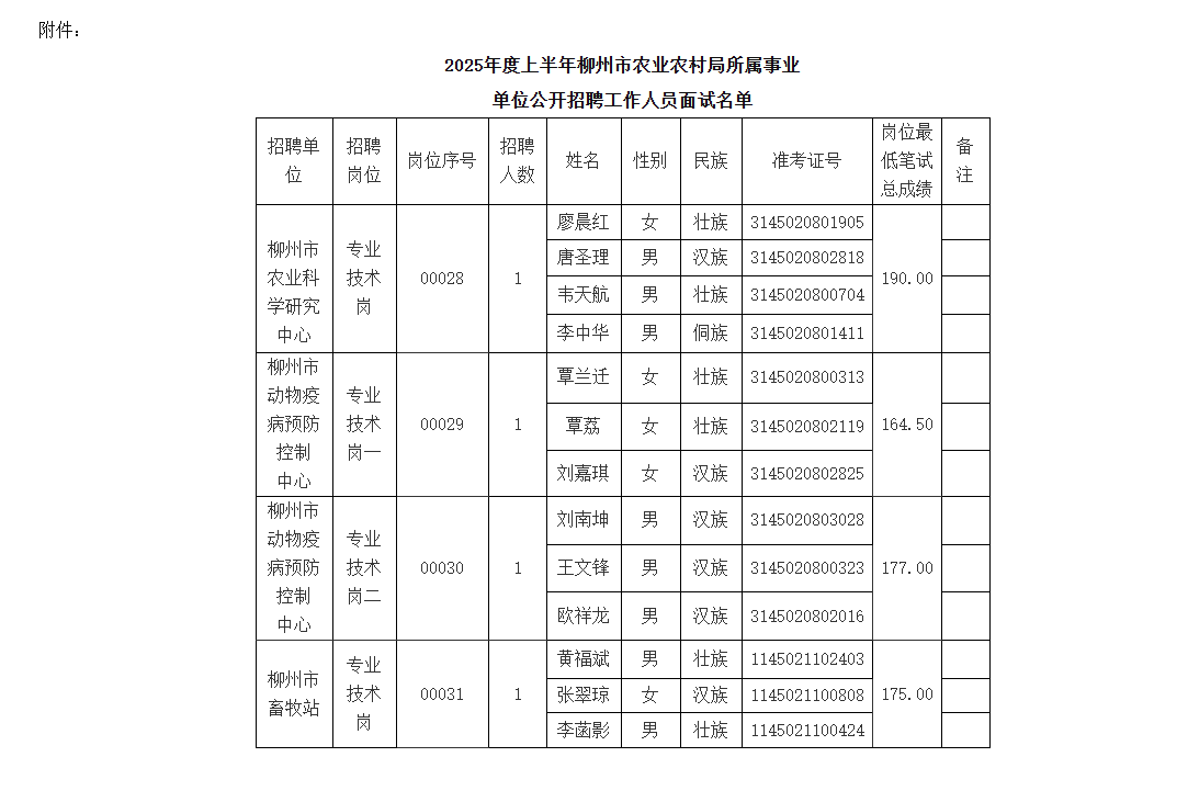 附件:2025年度上半年柳州市農(nóng)業(yè)農(nóng)村局所屬事業(yè)單位公開招聘工作人員面試名單
