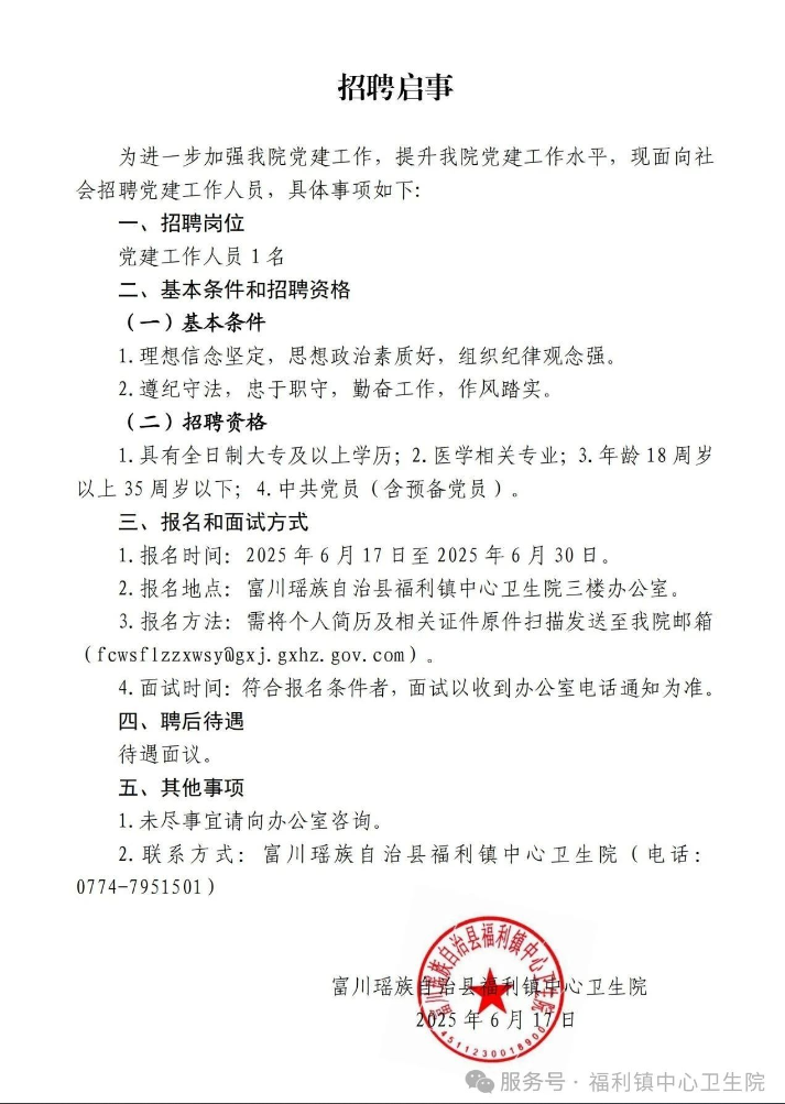 原文標(biāo)題:福利鎮(zhèn)中心衛(wèi)生院招聘1名黨建工作人員