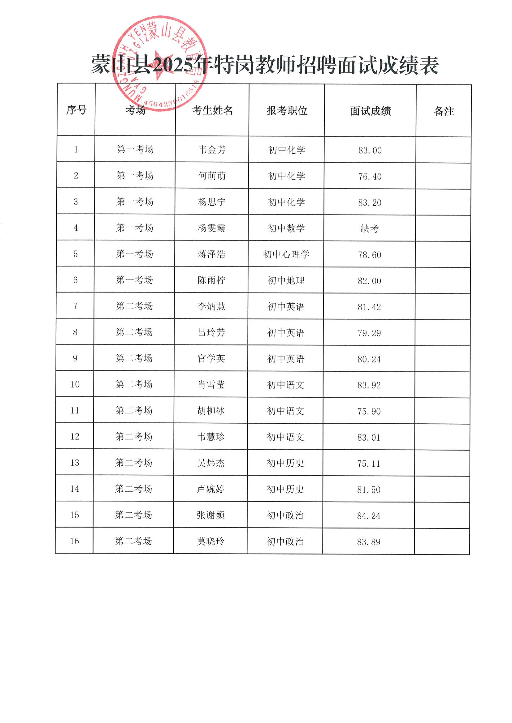 根據(jù)《蒙山縣2025年特崗教師招聘公告》相關(guān)要求,現(xiàn)將2025年特崗教師招聘面試成績予以公告(詳見附件)。進(jìn)入考核、體檢等后續(xù)環(huán)節(jié)的考生名單,縣教育局將另行點(diǎn)對點(diǎn)通知本人,不再進(jìn)行統(tǒng)一公告。請相關(guān)考生務(wù)必保持報(bào)名時(shí)所留手機(jī)號碼暢通,并注意查收信息。