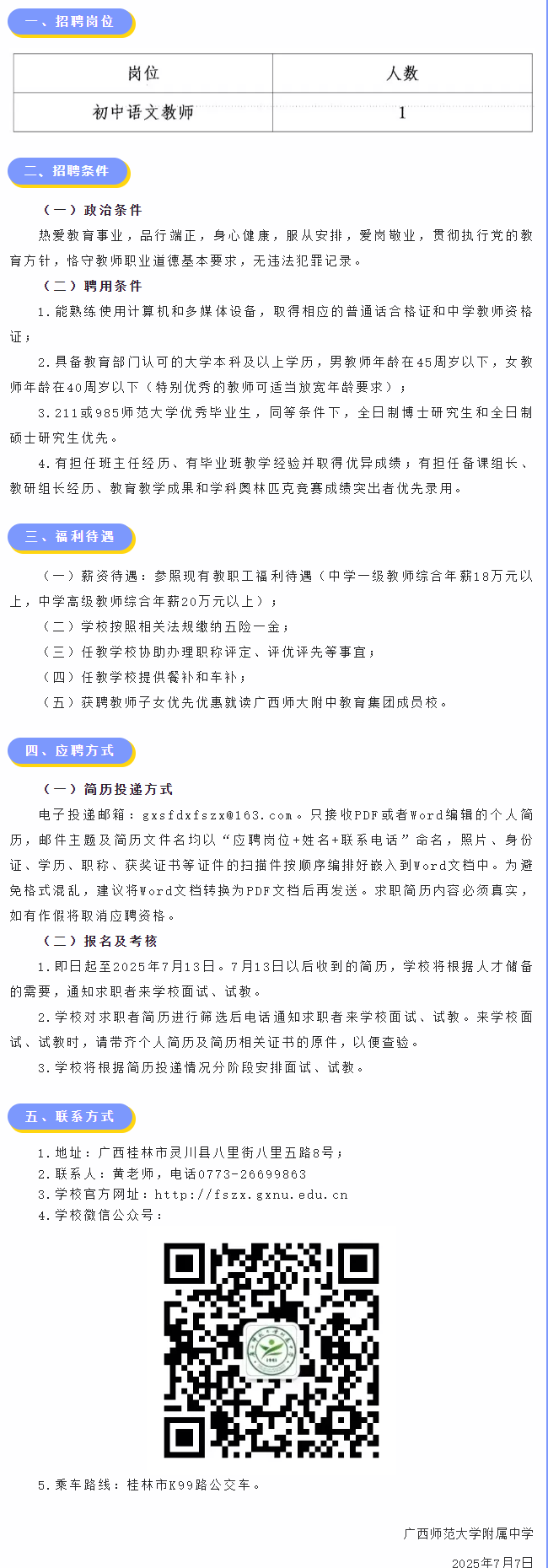 原文標(biāo)題:廣西師范大學(xué)附屬中學(xué)面向全國(guó)急聘初中語文教師1名