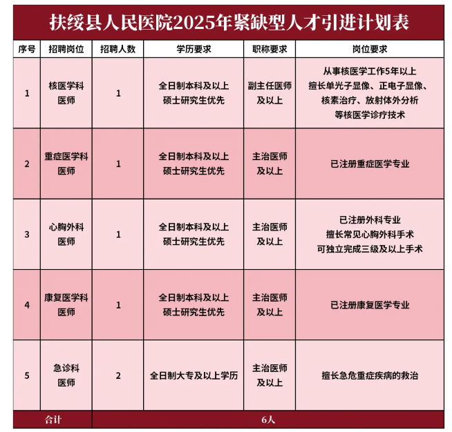 為進一步充實現(xiàn)有人才隊伍,促進醫(yī)院學(xué)科發(fā)展,提升醫(yī)院綜合實力,結(jié)合醫(yī)院實際工作需要,扶綏縣人民醫(yī)院決定面向社會進行公開招聘各類醫(yī)學(xué)人才,具體招聘事宜如下: