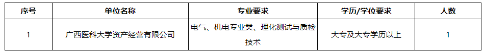 廣西醫(yī)科大學(xué)資產(chǎn)經(jīng)營有限公司(以下簡稱公司)是由廣西醫(yī)科大學(xué)于2011年8月3日獨資設(shè)立,經(jīng)營管理廣西醫(yī)科大學(xué)經(jīng)營性國有資產(chǎn)和對外投資的股權(quán)。公司依托學(xué)校和附屬醫(yī)院的資源優(yōu)勢,圍繞醫(yī)藥、養(yǎng)老、醫(yī)學(xué)檢驗、大健康項目等領(lǐng)域開展投資與合作,積極探索產(chǎn)學(xué)研協(xié)同發(fā)展。根據(jù)工作需要,現(xiàn)面向社會公開招聘工勤崗工作人員,具體招聘事宜如下: