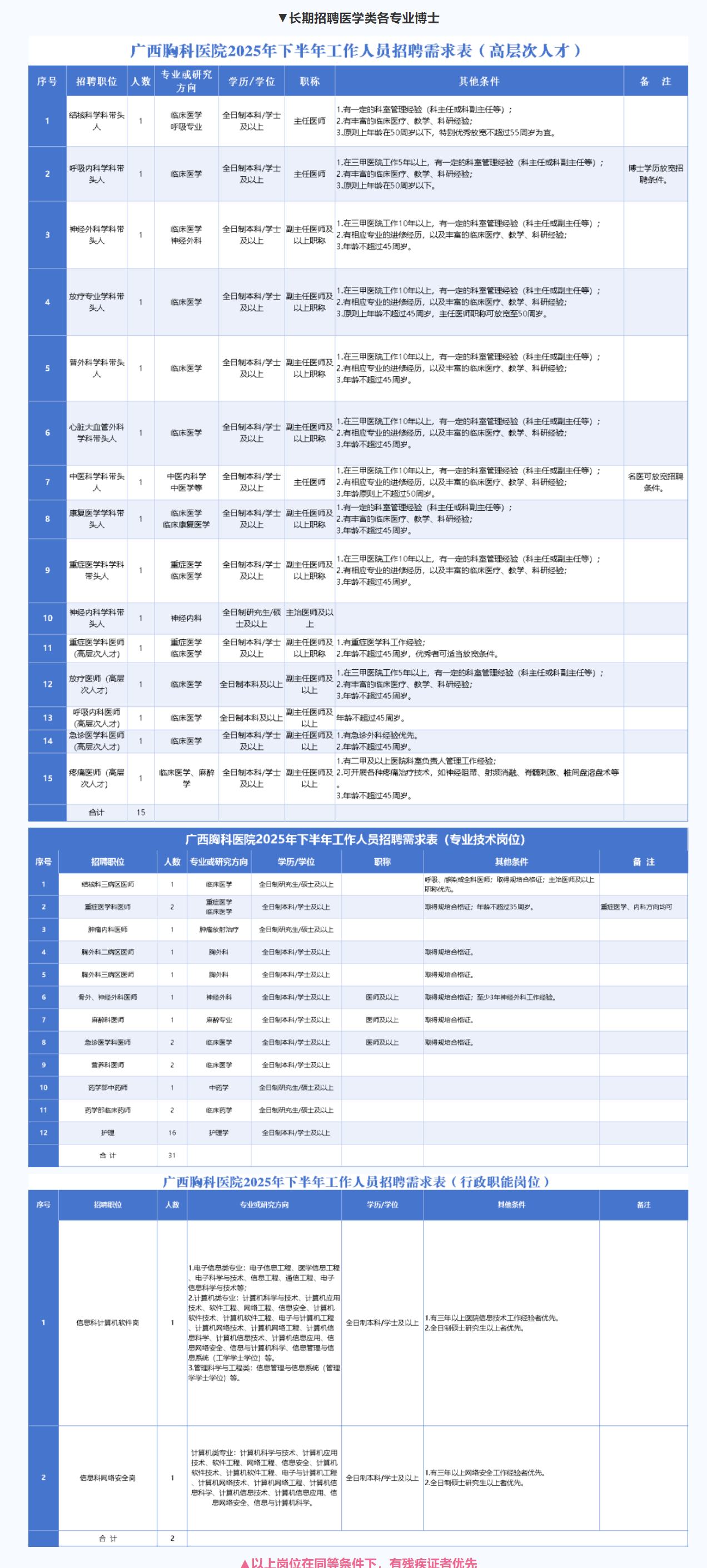 2.網(wǎng)上報名:請將招聘報名表及個人信息匯總表(詳見附件)、個人簡歷、身份證、學歷學位證、大學英語四六級考試成績報告單、在校期間成績單、資格證、執(zhí)業(yè)證、住院醫(yī)師規(guī)范化培訓合格證、獲獎證書電子版打包發(fā)送到廣西壯族自治區(qū)胸科醫(yī)院人事科郵箱gxltyyrsk@126.com。郵件統(tǒng)一命名格式為“崗位+學歷+姓名”,例如:“呼吸內科醫(yī)師+全日制本科+姓名”。