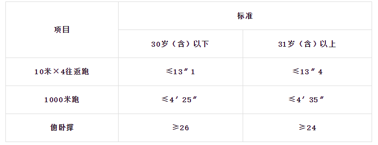 體能測試項(xiàng)目三項(xiàng)達(dá)標(biāo)的,視為合格。10米×4往返跑項(xiàng)目的測評(píng)次數(shù)不超過2次,1000米跑、俯臥撐等項(xiàng)目的測評(píng)次數(shù)為1次。