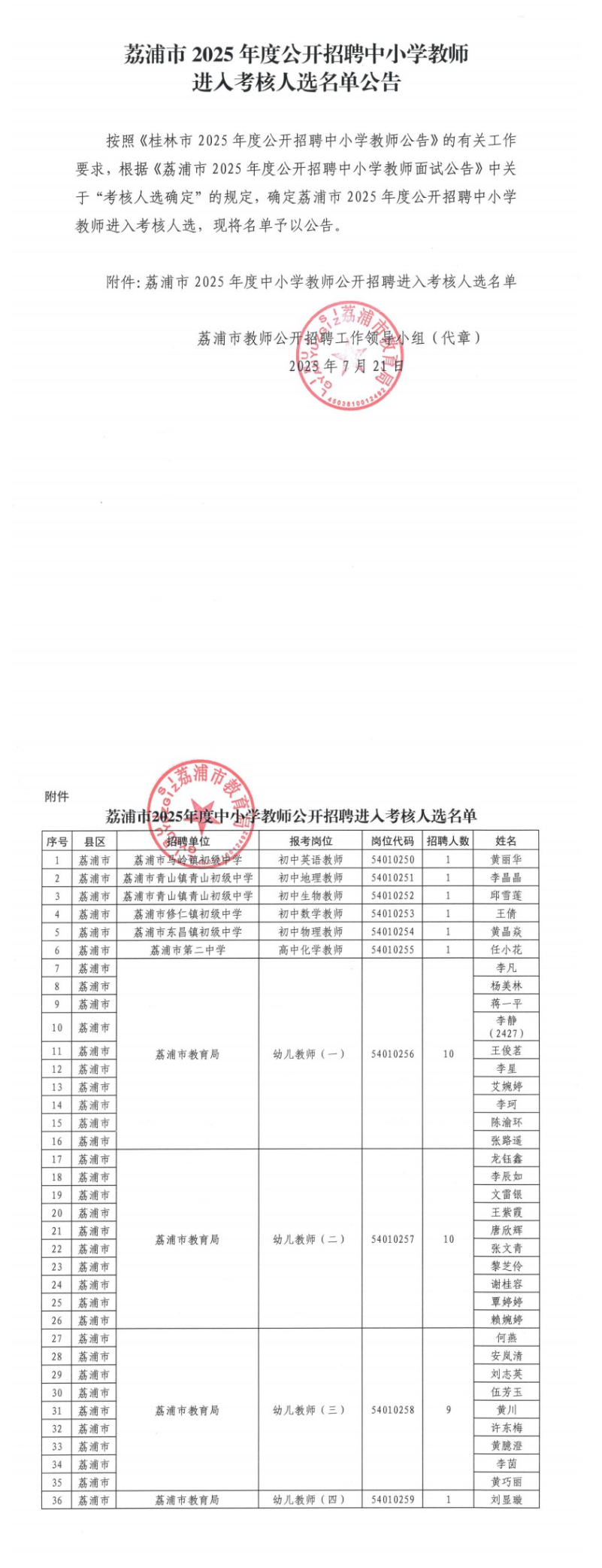 荔浦市2025年度公開招聘中小學(xué)教師進(jìn)入考核人選名單公告