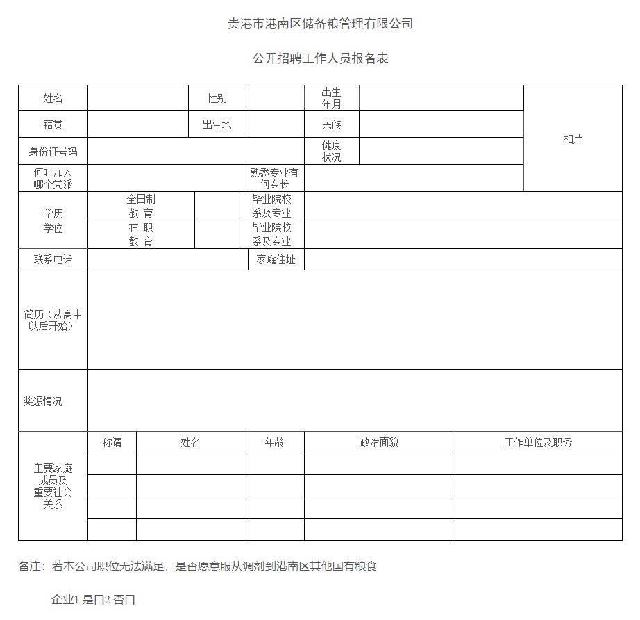 附件:貴港市港南區(qū)儲(chǔ)備糧管理有限公司公開招聘工作人員報(bào)名表