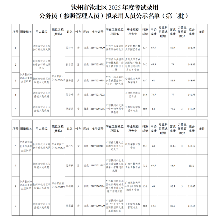 根據(jù)《廣西壯族自治區(qū)2025年度考試錄用公務(wù)員公告》等有關(guān)規(guī)定,經(jīng)過公開報名、資格審查、筆試、面試、體檢、考察等程序,擬錄用吳軒宇等9名同志為公務(wù)員(參照管理人員),現(xiàn)予以公示(附件)。公示期為5個工作日,如對擬錄用人員的錄用資格有異議,請在公示期內(nèi)向中共欽州市欽北區(qū)委員會組織部干部監(jiān)督股實名反映。