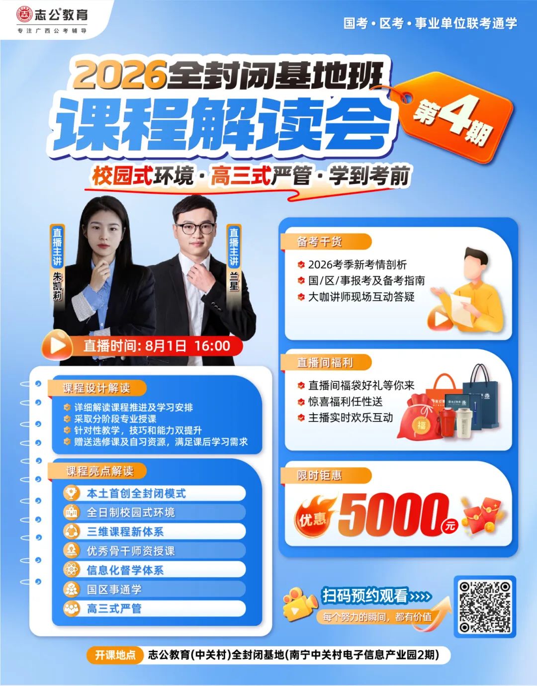 本次解讀會邀請到了朱凱莉、蘭星等資深講師。他們長期深耕公考領(lǐng)域,對廣西的公考形勢了如指掌。在解讀會上,講師們將為大家深度剖析2026考季的新考情、分享報考及備考指南,與同學(xué)們進行現(xiàn)場互動,更重要的是進行2026年全封閉基地班第4期課程設(shè)計解讀!讓你在備考之初就搶占先機。????