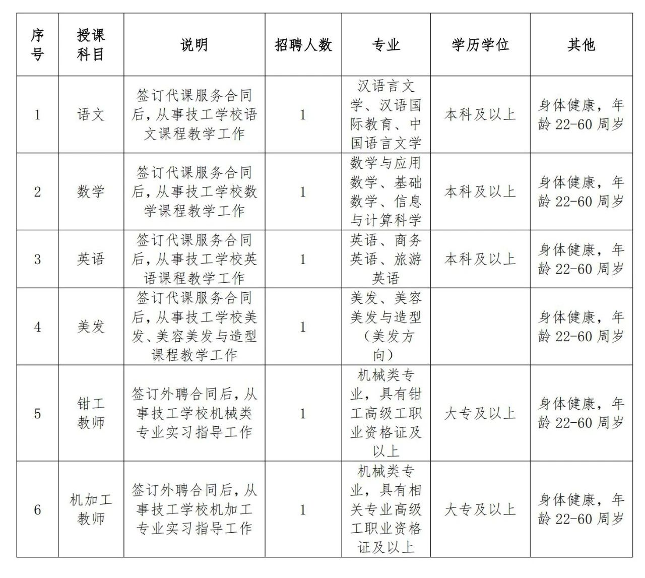 本次招聘代課教師4名,外聘教師2名,共6名,每人限報(bào)一個崗位,具體招聘崗位及條件如下: