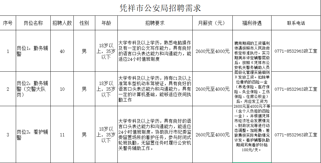 被聘用人員試用期為兩個(gè)月,試用期應(yīng)發(fā)工資為2600元/月(含個(gè)人負(fù)擔(dān)的四險(xiǎn)一金)。期滿不能勝任工作崗位者,不再聘用;不滿一月的按日均計(jì)算報(bào)酬;輔警享受帶薪年休假、年度健康檢查、人身意外傷害保險(xiǎn)等待遇。五、聯(lián)系方式:1、憑祥市公安局政工室 0771-85329632、憑祥市公安局交警大隊(duì)辦公室 0771-8521081