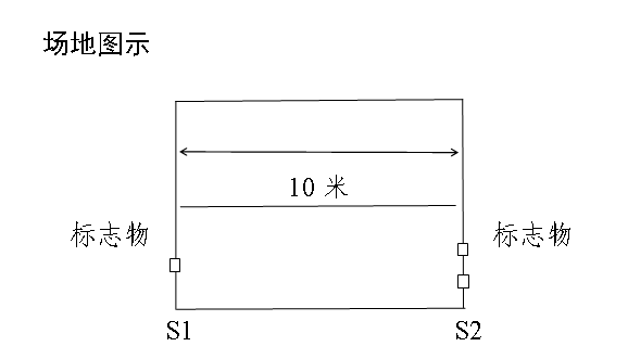 場地器材:場地為10米長的直線跑道,在跑道的兩端各劃一條5cm寬直線(S1和S2),將木塊(10cm×5cm×5cm)按每道3塊豎立擺放(其中2塊放在S2線上,1塊放在S1線上),秒表若干塊。