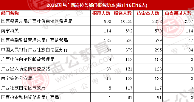國考報名第二天,不少同學(xué)還處在觀望狀態(tài)。目前報名人數(shù)前三的部門依次為:國家稅務(wù)總局廣西壯族自治區(qū)稅務(wù)局,報名人數(shù)10425人;南寧海關(guān),報名人數(shù)692人;國家金融管理總局廣西監(jiān)管局,報名人數(shù)626人;這三個部門的報考總?cè)藬?shù)達(dá)11743人,報考熱度高度集中。