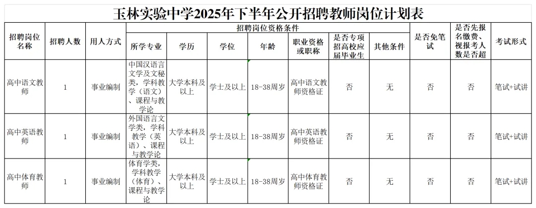 具體招聘信息請(qǐng)瀏覽玉林市人社局網(wǎng)站相關(guān)公告,以《玉林市2025年下半年公開(kāi)招聘中小學(xué)幼兒園教師公告》為準(zhǔn)。